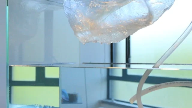 Pulling myself away from Undersea, I arrive at Vessels of Touch, two small basins full of ice, standing on metal rods, encircled into a duo by a copper plate and a rock of salt that absorb waters dripping down from the top. The ice drips in attunement to Ocean Held, a glass vessel that balances on another material rod that holds a vessel and, in it, a piece of ice cast as an oyster shell. Both stand out as vibrant situations where the artist’s hands once again are touching towards uncertainty as a generative place to be for an alternative critical politics of touch. This time, the artwork unequivocally stages where touch that grabs leads - towards the planetary melting. Hannah’s companion, ice, this queer body of water that drifts the oceans and cracks metal pipes, lands its melting body for that. One cannot hold this aquatic trickster too tight even if one tries. It escapes, melting, evaporating, making puddles that unfurl on the metal surface, shape-echoing Tentacular, a circle of ceramic tentacles that colourfully rhymes with Undersean and that rests on the gallery wall to my left. Wording and worlding with the titles between the three artworks, Hannah seems to pull us to a realisation that a vessel is not simply a container that preserves pre-existing entities. Rubbing the titles against the material situations of her artworks, Hannah suggests a slight but powerful challenge-tweak of imagination: for a mind-body that refuses dominant Western thinking in sovereign entities, vessels do not solidly isolate but stand for nascent material intimacies. There is nothing solidly hard, everything is hardly solid. Even rocks liquify and evaporate becoming ephemeral fragrant cloud of Petrichor (Living Waters), a metal construction that might be speculatively forming a new chemical formula with all of its branches, holding more glass and more ice in its many containers of potential.